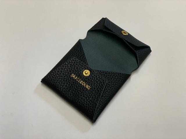 洋封筒の展開図と同様のカッティングで1枚革を使った封筒型の名刺入れor小銭入れ 100-F ブラック H 7cm × W 10.5cm BRASSBOUND_01(ブラスバウンド_01)は、紙製品を革素材に落とし込んで製作されるラインです。 紙袋や手提げ袋、封筒や紙箱をデザインソースとし、日常生活の中で見慣れたものを上質なレザーに変換しています。 紙袋をモチーフとしたバッグはシワ加工などを施すことで味わいのある表情をかもし出しています。